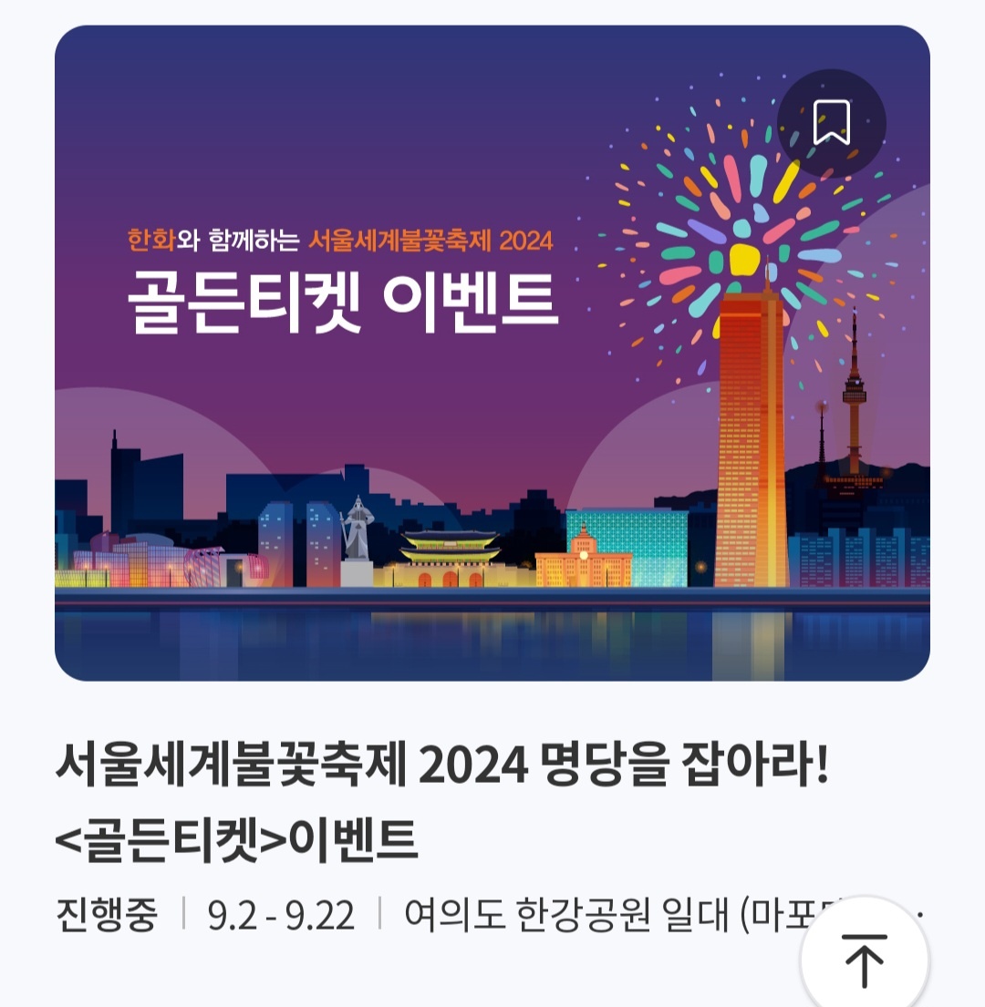 가입을 하신 뒤 앱 초기화면으로 들어가면, 밑에 '2024서울세계불꽃축제 골든티켓 이벤트'라는 배너가 있습니다.
